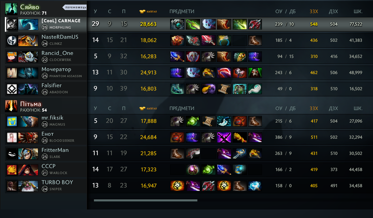 Хех, насчёт фарма, не первый раз говорят. Да, об этом я ещё в комменте упоминал, я не очень люблю фармить, тем более за морфа, (хотя герой отлично для этого подходит) но мне больше нравиться на килах поднимать голду, а тут в теории есть возможность делать кил по кд ульты, хоть и не всегда выходит. Если всё плохо то конечно лучше в леску посидеть. А в данном случае на первой позиции так-то фантомка, хотя она по игре ой как мало могла.