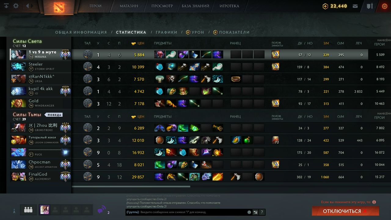 6. Игра. Ну тут я вообще офигел. Мне в команду кинуло трех челиков с премутом (я такого вообще никогда не видел). В общем мы сделали фб и после этого фб вражеская Луна ливнула. Я уже подумал что ура победка, но не тут уже было. Луна вернулась, но мне удалось пару раз её убить вместе с Гримстроуком на лайне и они двоем окончательно покинули игру. Остались только Пудж, Мипо и Тайдхантер. Как вы думаете, удалось ли нам выиграть против трех героев? Нет. А почему? Потому что 4 челика всю игру стояли фармили. Мне пришлось в соло сплетпушить вражеские лайны чтобы хоть как то закончить эту помойную игру. Но к сожалению мой керри Гирокоптер за 50 минут ничего не смог нафармить, саппорты нафидили Мипо и собственно Мипо с аегой, а так же Пудж и Тайд просто нажали ПКМ на наш трон и сломал его за минуту. Т.к до этого все мои тиммейты умерли не понятно где без байбеков и собственно трон упал. Ах да, вы скажете что Энча пыталась выиграть судя по её киллам? Вот нет, 6 Килов Энча сделала на Гриме и Луне которыми враги отпушивали лайны. Так же прошу заметить что я купил Аганим чтобы кидать дуэль в Тайда чтобы он не смог кидать Равагу, но моя команда вливала весь свой дамаг в Тайда под Аганимной дуэлью и после того, как все их скиллы ушли в кд, влетал Мипо и делал изи фраги.