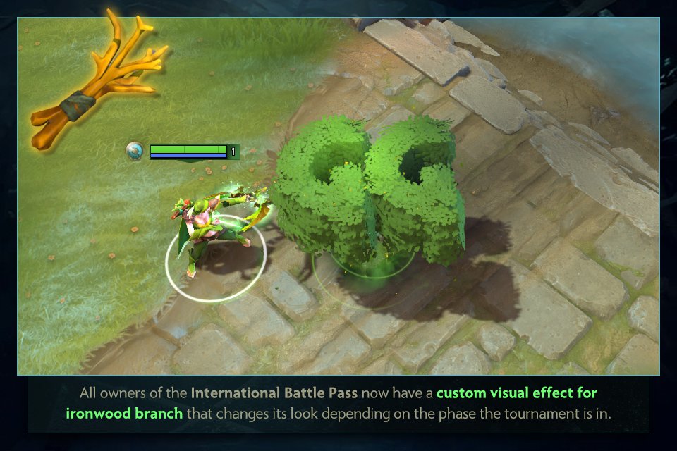 - Все владельцы компендиума The International 2017 теперь имеют уникальный эффект дерева, которое появляется из Iron Branch. Он будет меняться в зависимости от стадии турнира.